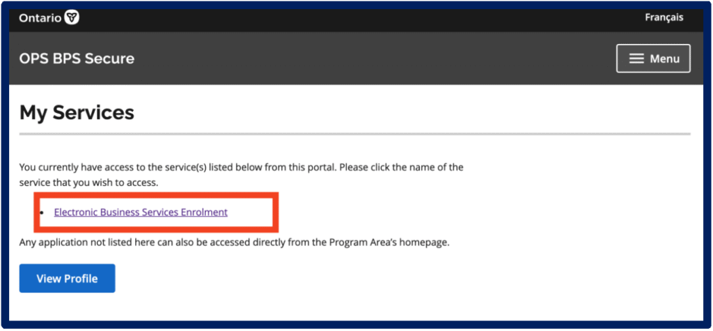 Step 1: Log in to your OPS BPS Secure account and select "Electronic Business Services Enrollment"