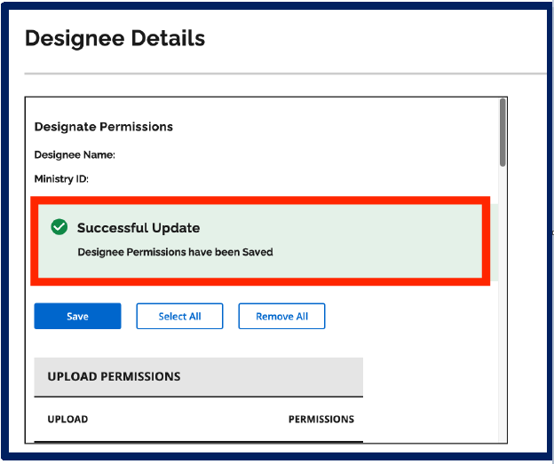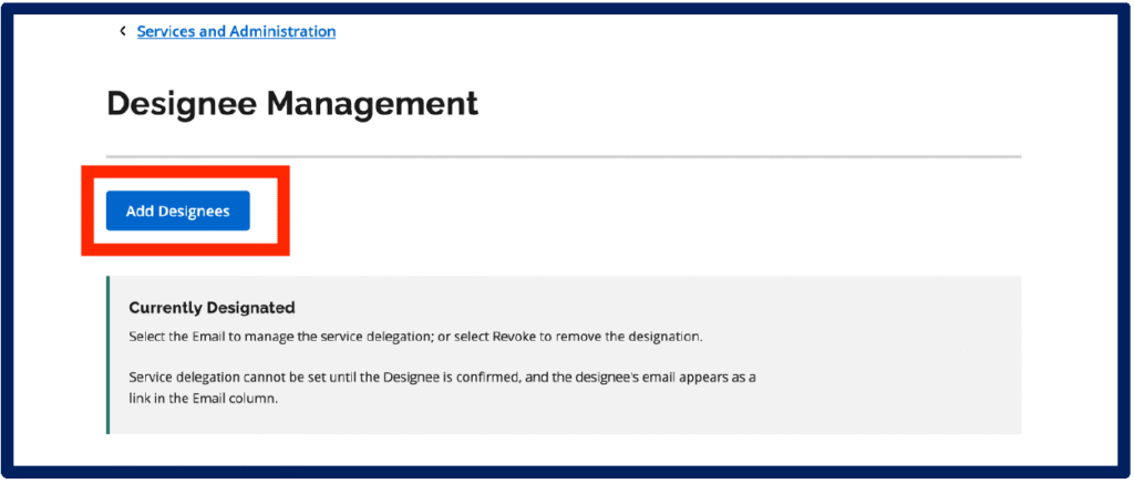 Step 5: Click "Confirm this Designation" to complete adding designee. The MOH will match this information in their database. If you receive a prompt, confirm that the information above matches the information on your screen and select "Confirm this Designation" to continue.