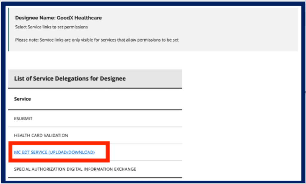 MC EDT: The Medical Claims Electronic Data Transfer system allows healthcare providers to submit claims electronically to the Ontario Health Insurance Plan (OHIP).